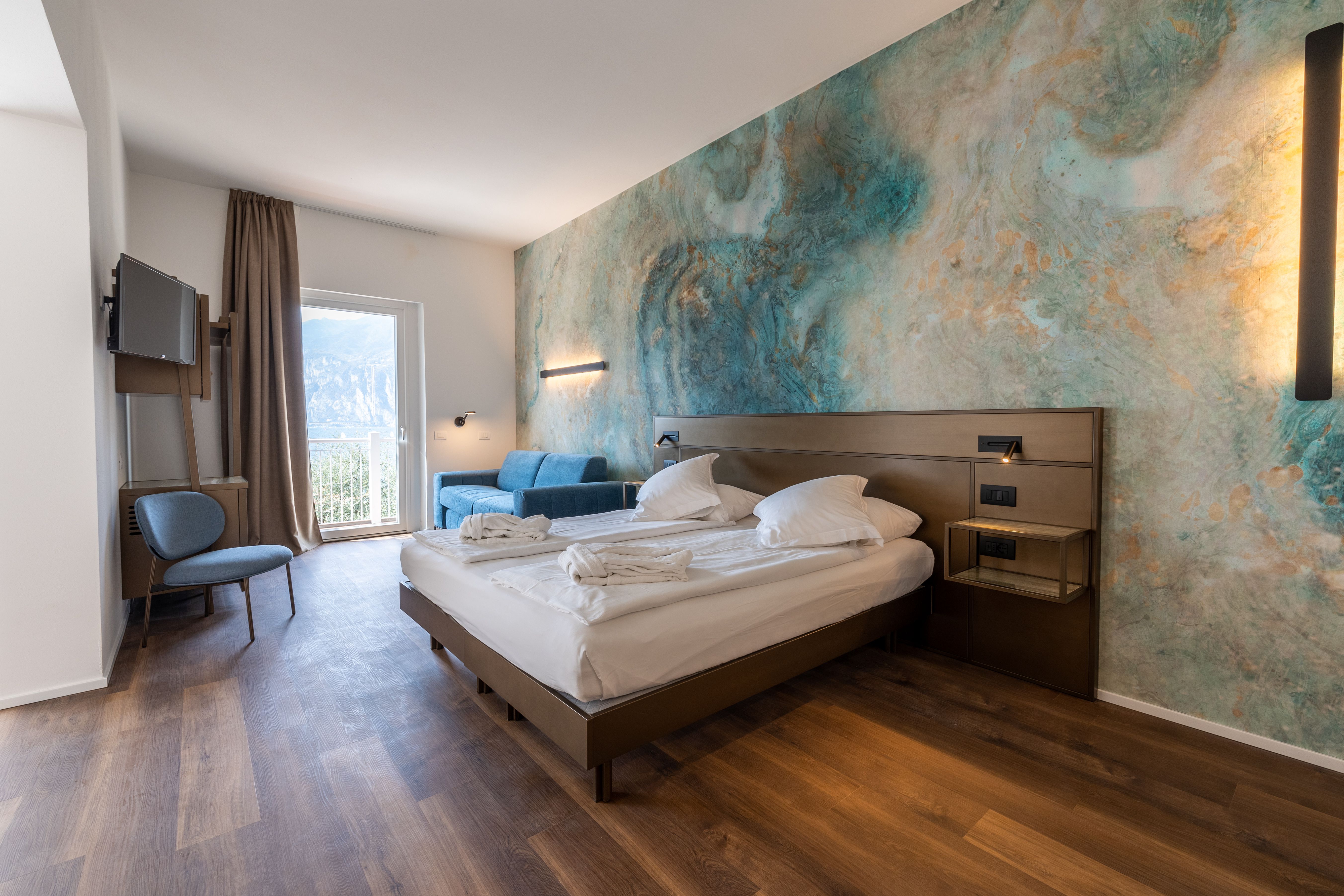 Die neuen, geräumigen, eleganten und erlesenen Zimmer Ponale sind ideal für einen romantischen Aufenthalt: Direkt vom großen Doppelbett aus können Sie nämlich das blaue Wasser des Sees bewundern. Ein kleines Wohnzimmer, zwei Balkone mit Seeblick, das Badezimmer mit Badewanne und großen Wellnessduschen sorgen für einzigartige Momente der Entspannung ...